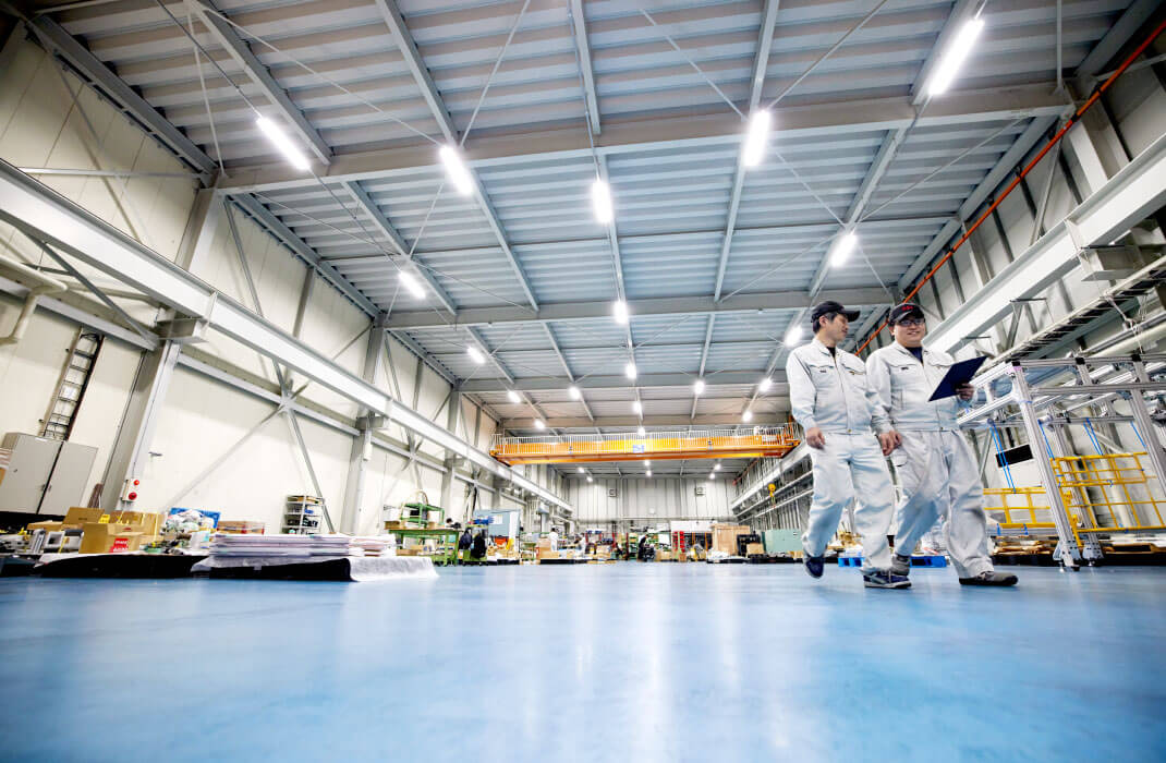 広い組立工場その広さが大きな魅力の一つといえる当社の工場。全長90mもの奥行きを誇る本社工場では、ラインにそった組立作業ができるため、お客様の工場での据付もスムーズです。大垣工場では、高さ8mの大型設備の組立が可能で、15tクレーンも所有。小規模から大規模まであらゆる専用機械設備のニーズに応えられるのは、こうしたスケールメリットを生かした製造環境があるからこそ。大きな強みとしてフル活用しながら、日本のモノづくりを支え続けます。