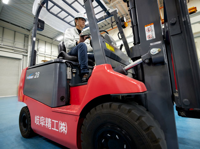 たとえば現場では、フォークリフトの運転やクレーン操作などが必要なケースがあります。岐阜精工では、そんな業務で必要とされる公的な技能資格のため、資格取得をサポートしています。各種資格試験に関わる費用はもちろん、講習会受講のための費用などを会社が一部または全額負担しています。すべての資格が対象ではありませんが、さらなるスキルアップを図りたいとの思いに応え、一人ひとりの成長をサポートしています。